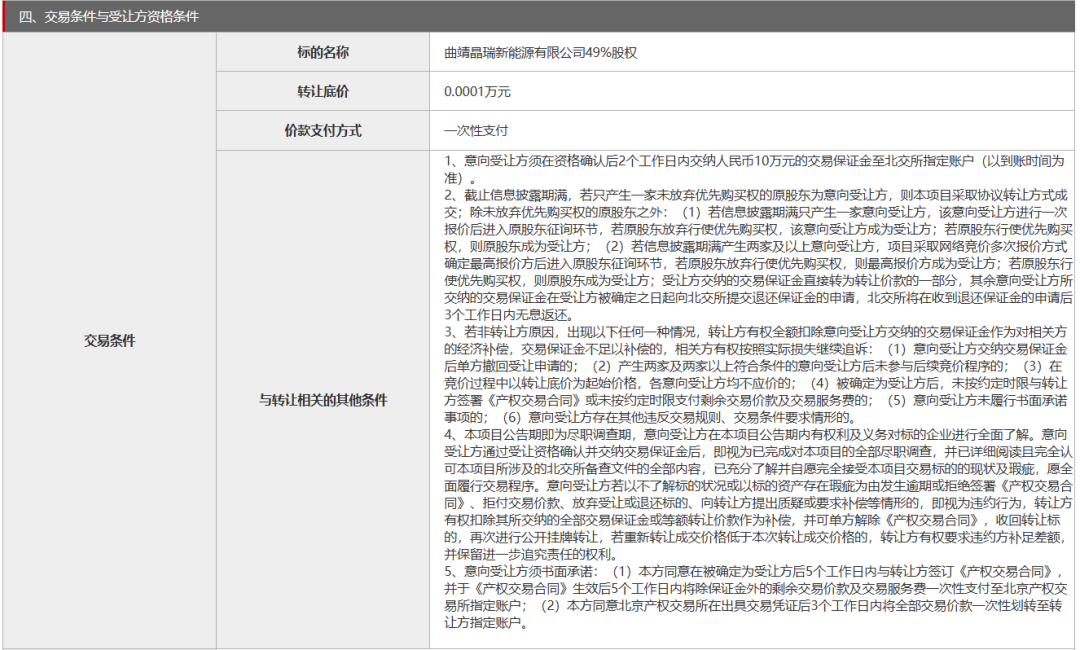 7月16日,北京产权交易所发布三峡新能源挂牌转让曲靖晶瑞新能源有限公司49%的股权公告,转让底价0.0001万元。